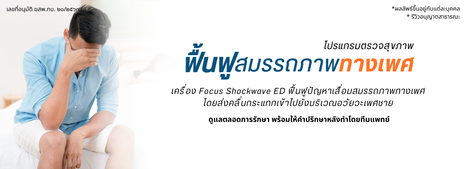 Shock Wave for Erectile Dysfunction (ED) เป็นเทคโนโลยีล่าสุดในการรักษาภาวะหย่อนสมรรถภาพทางเพศ เนื่องจากเลือดไปเลี้ยงอวัยวะเพศไม่เพียงพอขณะมีเพศสัมพันธ์ ด้วย Shock Wave Therapy คือ การใช้คลื่นเสียงที่มีความเข้มต่ำแบบแรงกระแทกจากภายนอก ไปกระตุ้นบนอวัยวะเพศของคุณผู้ชาย เป็นผลทำให้เกิดการสร้างหลอดเลือดใหม่เพิ่มขึ้นในอวัยวะเพศจากหลอดเลือดเดิม เมื่อหลอดเลือดในอวัยวะเพศทำงานได้ดีขึ้น การตื่นตัวและการขยายของอวัยวะเพศจึงมีประสิทธิภาพมากขึ้น นับเป็นทางเลือกใหม่สำหรับผู้ป่วยที่มีภาวะผิดปกติการแข็งตัวของอวัยวะเพศ ซึ่งมีความปลอดภัยสูง ปลอดภัยจากผลข้างเคียงจากการรักษาด้วยการใช้ยา หลังการรักษาด้วย Shockwave Therapy ผู้รักษาสามารถ ลดยา และหยุดยาได้