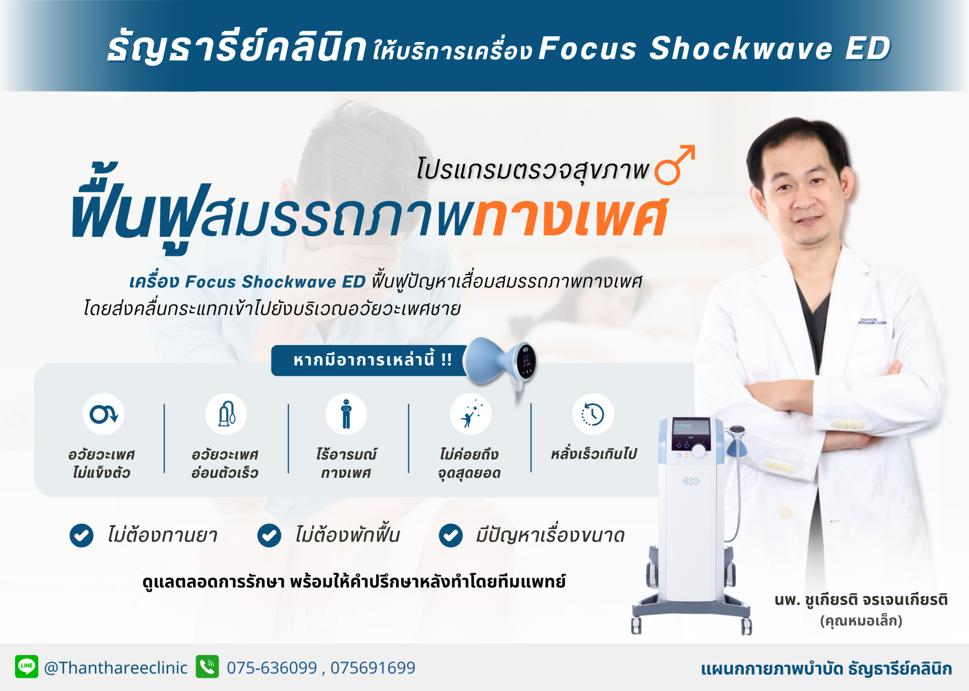 เป็นเทคโนโลยีล่าสุดในการรักษาภาวะหย่อนสมรรถภาพทางเพศ อันเนื่องจากเลือดไปเลี้ยงอวัยวะเพศไม่เพียงพอขณะมีเพศสัมพันธ์ ด้วย Shock Wave Therapy คือ การใช้คลื่นเสียงที่มีความเข้มต่ำแบบแรงกระแทกจากภายนอก ไปกระตุ้นบนอวัยวะเพศของคุณผู้ชาย เป็นผลทำให้เกิดการสร้างหลอดเลือดใหม่เพิ่มขึ้นในอวัยวะเพศจากหลอดเลือดเดิม เมื่อหลอดเลือดในอวัยวะเพศทำงานได้ดีขึ้น การตื่นตัวและการขยายของอวัยวะเพศจึงมีประสิทธิภาพมากขึ้น นับเป็นทางเลือกใหม่สำหรับผู้ป่วยที่มีภาวะผิดปกติการแข็งตัวของอวัยวะเพศ ซึ่งมีความปลอดภัยสูง ปลอดภัยจากผลข้างเคียงจากการรักษาด้วยการใช้ยา หลังการรักษาด้วย Shockwave Therapy ผู้รักษาสามารถ ลดยา และหยุดยาได้